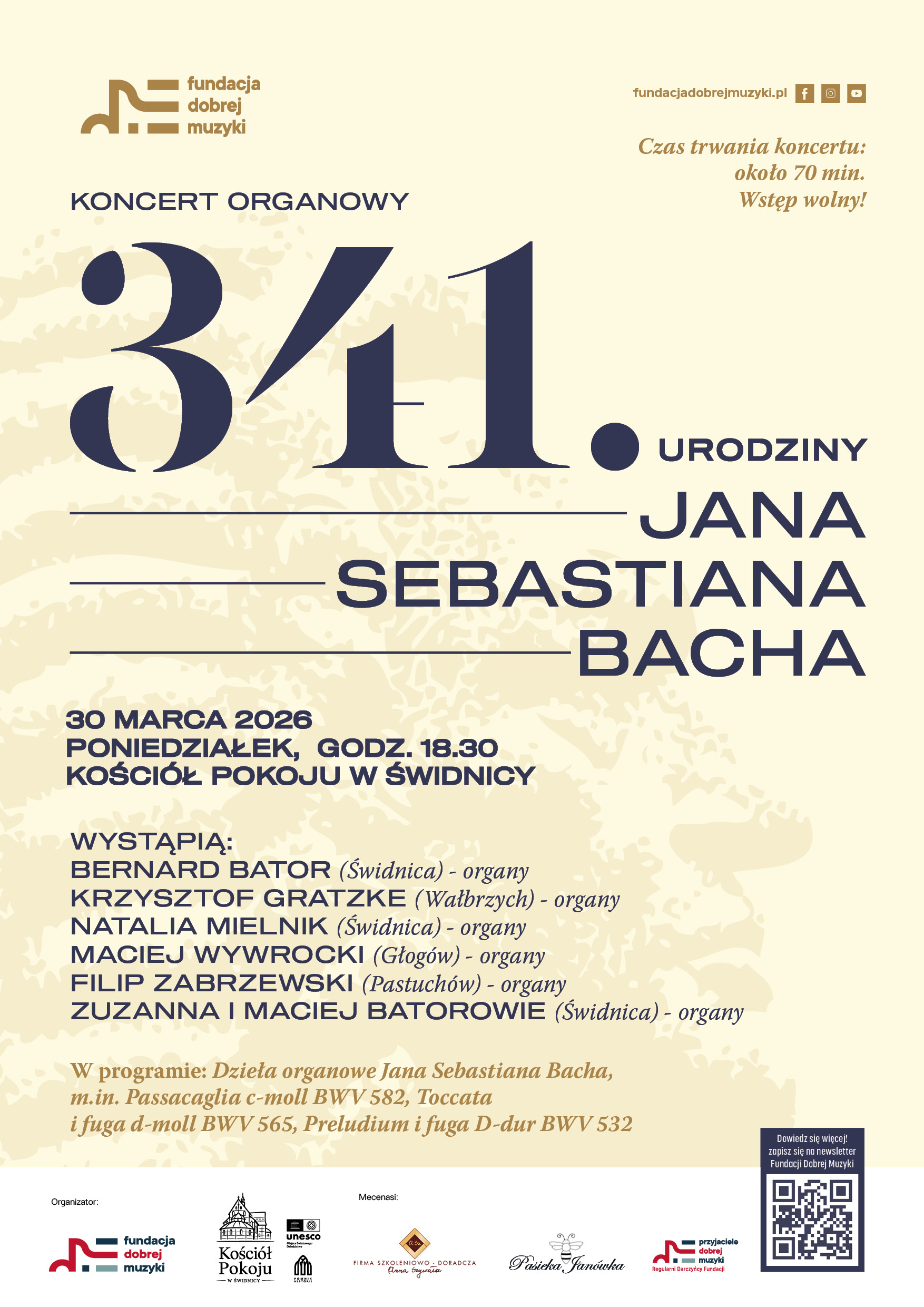Wystąpią: Natalia Mielnik, Maciej Wywrocki, Filip Zabrzewski, Krzysztof Gratzke i Bernard Bator. W programie znajdą się dzieła organowe Bacha, należące do najważniejszych utworów w historii muzyki, m.in. Passacaglia c-moll BWV 582, Toccata i fuga d-moll BWV 565 oraz Preludium i fuga D-dur BWV 532.